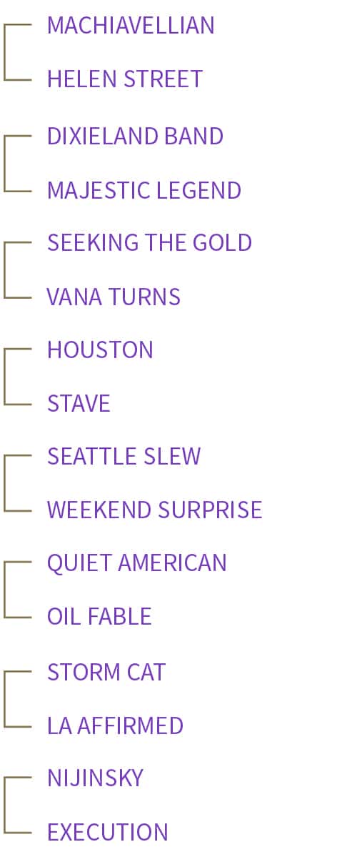 Empire Maker is a son of Unbridled. Unbridled’s son, Unbridled’s Song is broodmare sire of a Street Sense stakes winner, and he could be introduced through Arrogate, Liam’s Map, Cross Traffic, Rockport Harbor, First Defence, Songandaprayer, Midshipman, Even the Score, Half Ours, Zensational (broodmare sire of a Street Sense line stakes winner) and Old Fashioned. Unbridled is also sire of Grindstone (the sire of Birdstone) and Broken Vow. Other branches of Fappiano include Quiet American (who is grandsire of Midnight Lute), Rubiano (sire of Too Much Bling and Burning Roma) and Candy Ride (sire of Vekoma, Rock Your World, Twirling Candy and Gun Runner).